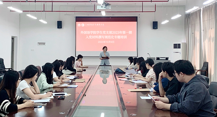 为进一步提高学生党员和入党积极分子材料的规范性和严谨性,2023年10月9日,乐动体育app 学生党支部于武鸣校区A9博雅楼603会议室开展2023年第一期入党材料撰写规范化专题培训。培训由学生党支部书记郭晶晶同志及党员韦紫怡同志主讲,党支部党员和最新一批发展对象参加。
