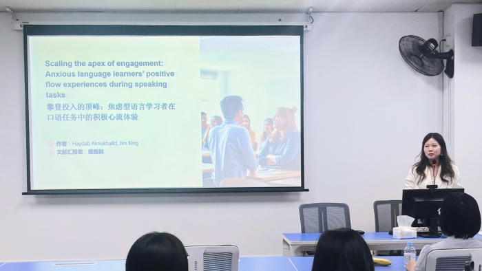 会上,周小琳和唐施祺两位老师做了详细汇报,并对未来研究方向进行了展望。周小琳老师以“研究生使用ChatGPT进行学术文本修改:行为、认知和情感参与”为主题进行汇报,从行为、认知和情感三重多维框架,考察ChatGPT有效融入二语写作文本修改的过程。唐施祺老师以“攀登投入的顶峰:焦虑型语言学习者在口语任务中的积极心流体验”为题,着重探讨了焦虑型学习者如何在精心设计和调整的口语任务中沉浸式获得积极情绪,缓解焦虑,进而获得并维持心流体验。